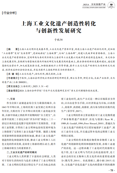 《上海经济》2025年第三期所刊发的于秋阳研究员论文《上海工业文化遗产创造性转化与创新性发展研究》,被中国人民大学书报资料中心复印报告资料G01《文化创意产业》2025年第六期全文转载。